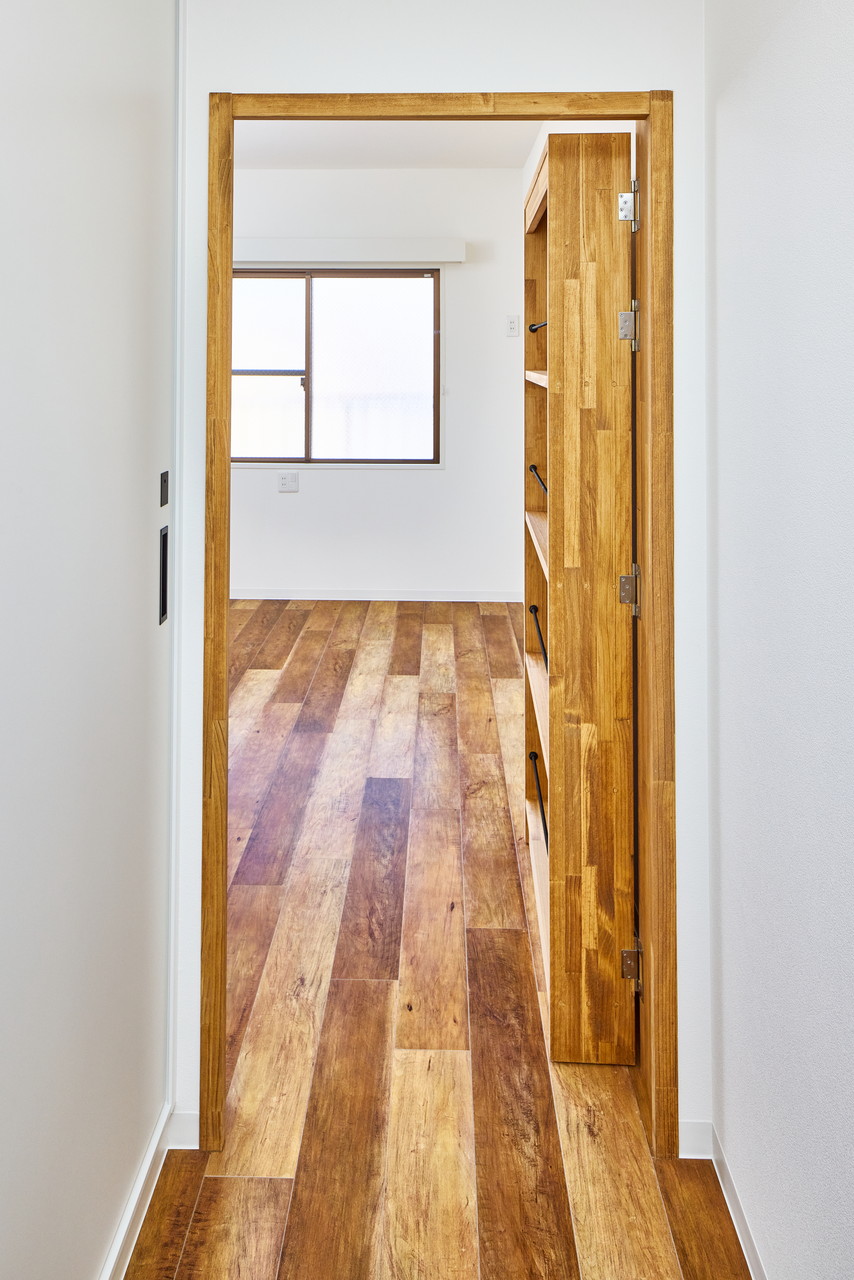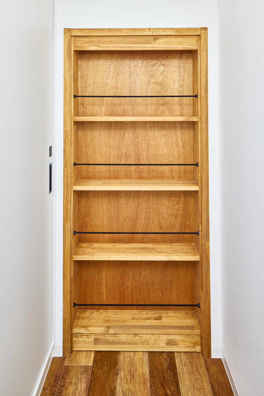 また、玄関そばにはおしゃれな木製のブックシェルフを設置。