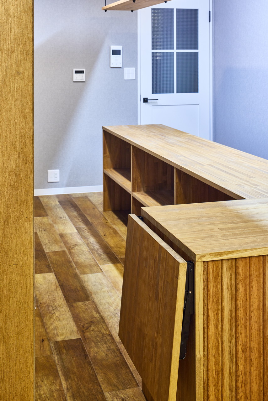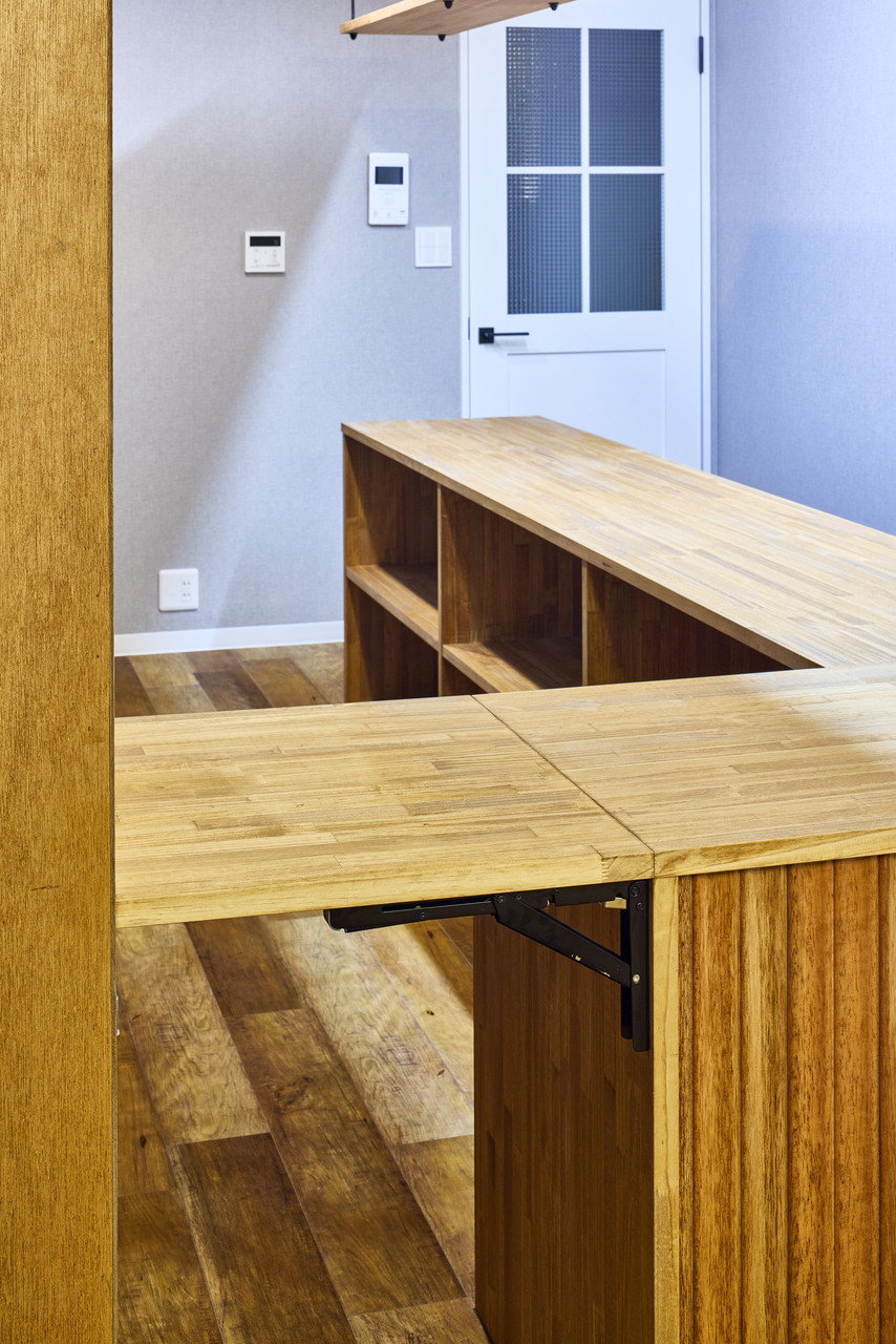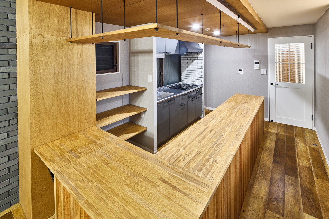 リブパネルがかわいいキッチンカウンターは、跳ね上げ式の天板や吊り下げの収納棚など、まるで隠れ家バーにいるような雰囲気を自宅でも味わえるデザイン。