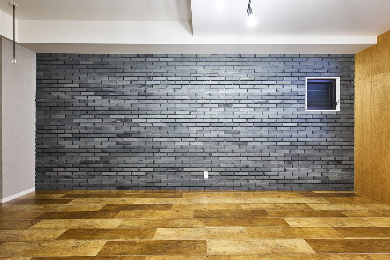 キッチンの横のリビングルームの壁にはグレーのブリックタイル。