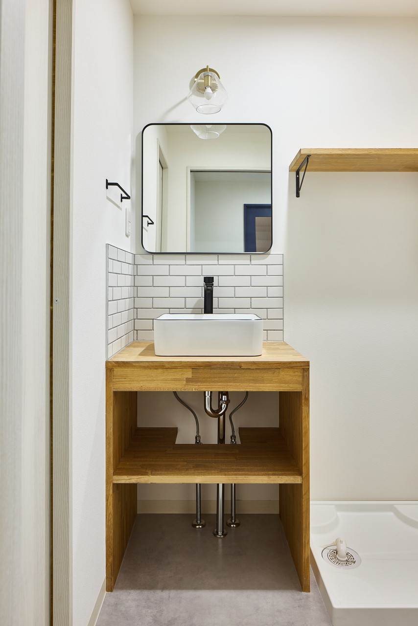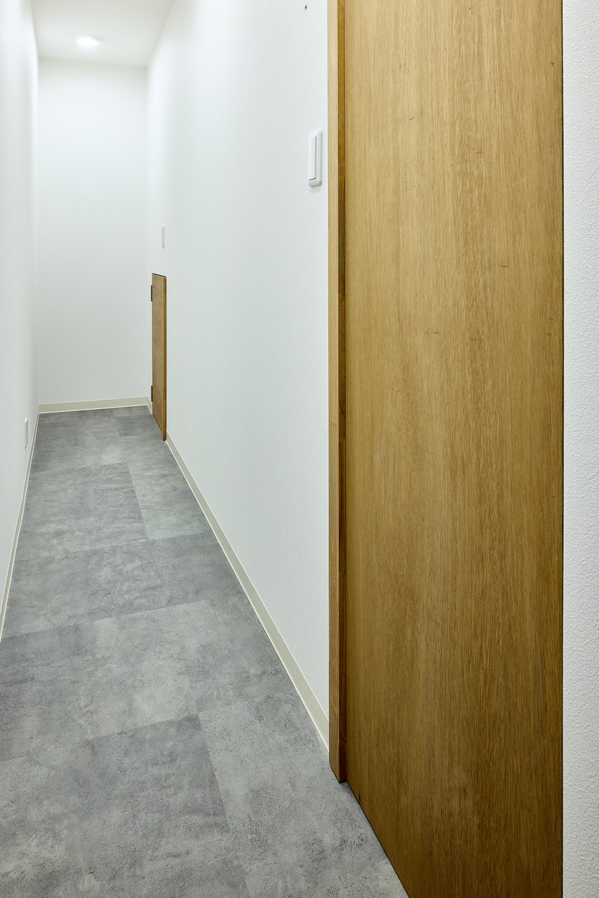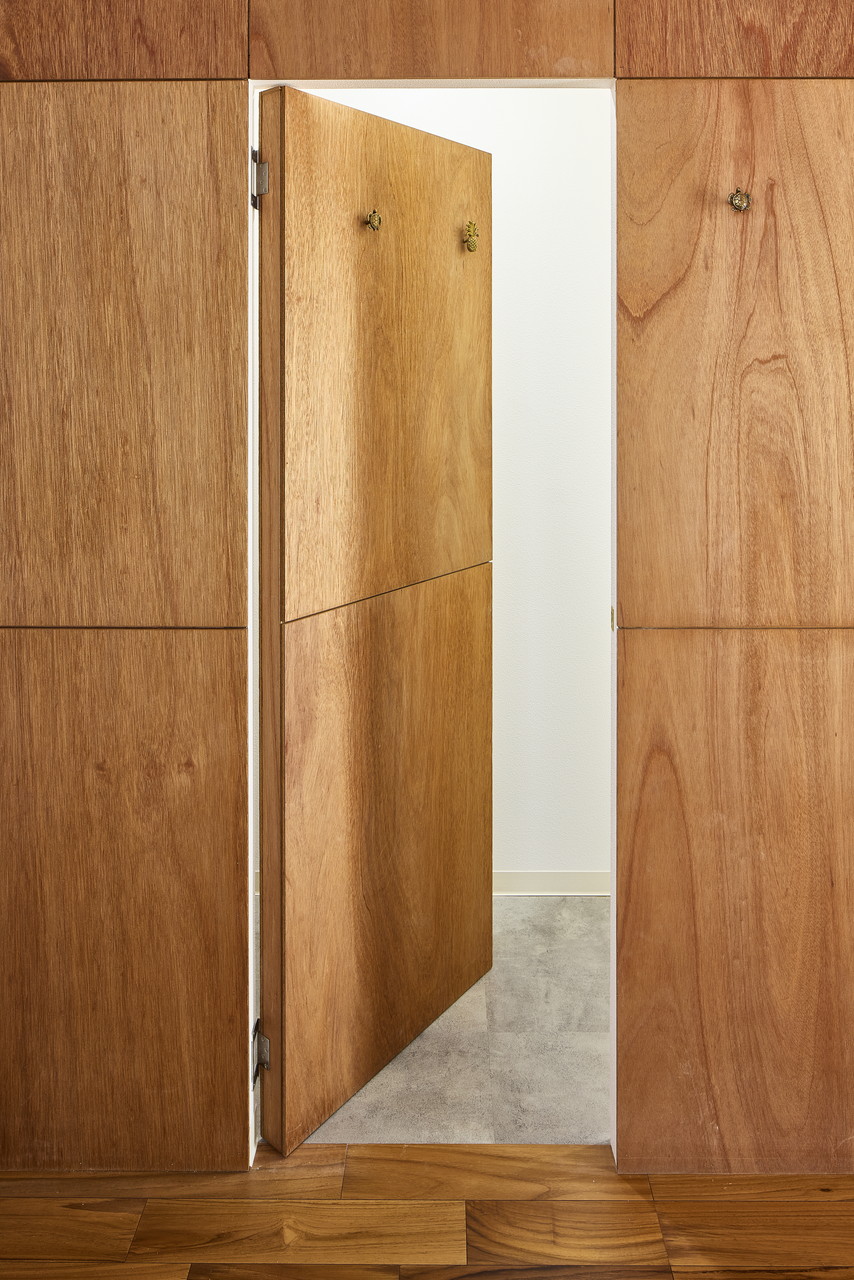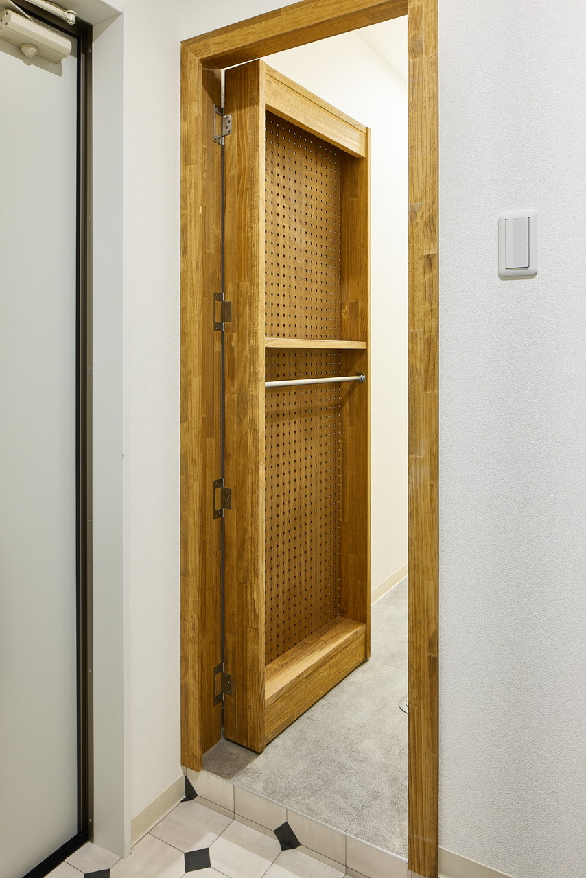 このバックヤード、玄関からもアクセスできるようになっていて、こちらは木製シェルフが秘密の扉になってます。