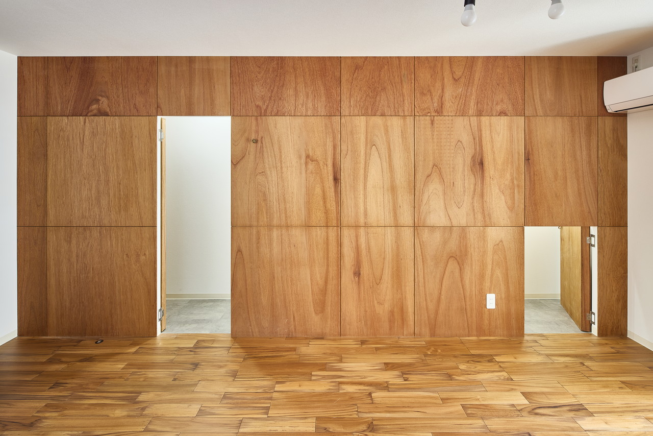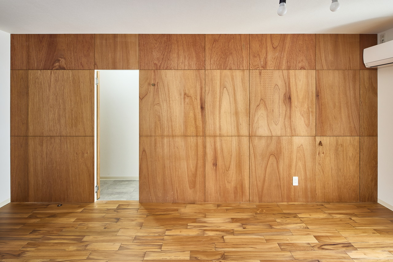 リビングルームは壁一面をかっこいいラワン合板でつくりました。