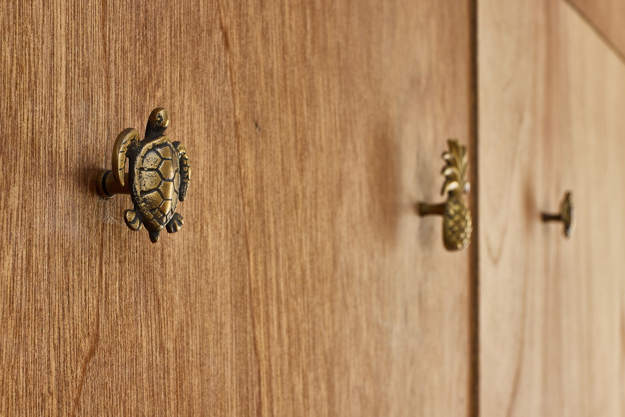ラワンの壁に開閉用に取り付けられた、カメとパイナップルをモチーフにした金属フックはデザイナーによる崩し技。