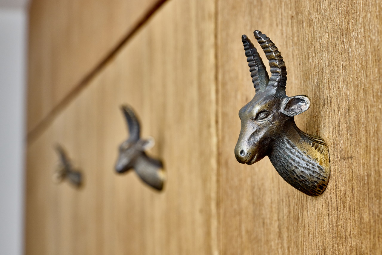 寝室の奥の壁はラワン合板の壁があり、そこに鹿モチーフのフックが付いています。