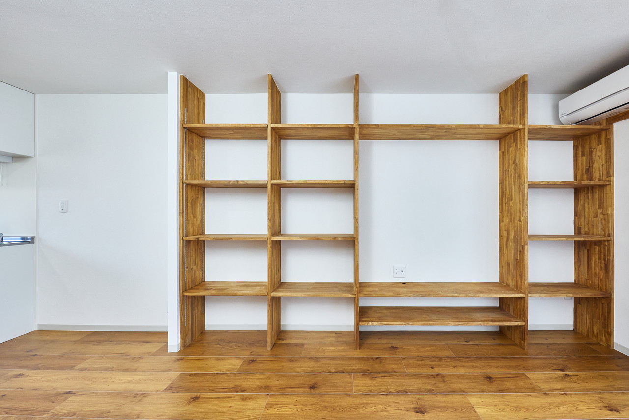 リビングルームには壁一面に造作棚を設け、収納たっぷり。